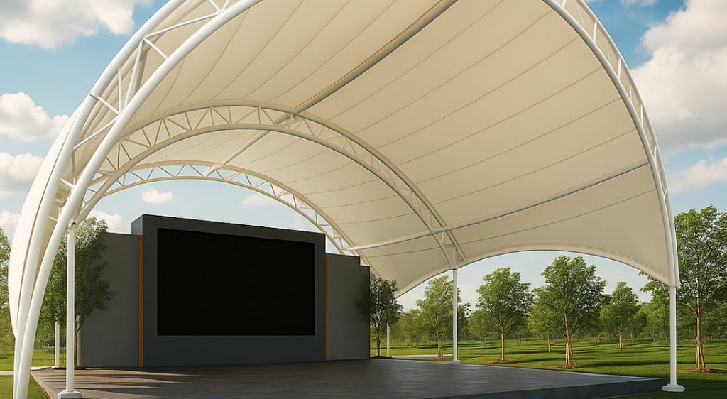 Jasa pembuatan atap membrane area komersial & kafe outdoor. Desain modern, kuat, dan tahan cuaca. Cocok untuk restoran, taman, dan area publik.