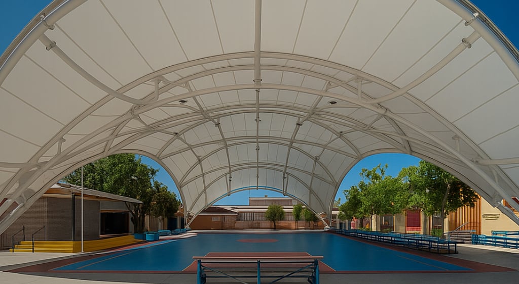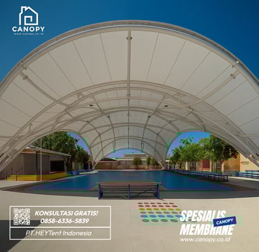 Ahli jasa canopy membrane Palembang. Desain modern, kuat, bergaransi, dan cocok untuk carport, kafe, serta lapangan olahraga.